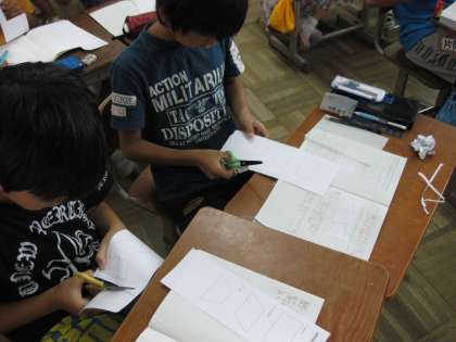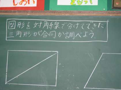 算数の時間ですが,はさみを持ってプリントを切っています。どんな勉強をしているのかと思ったら,図形を対角線で切った三角形は合同かどうかを調べていました。予想して具体的操作を入れて確かめました。予想どおりでしたか?
