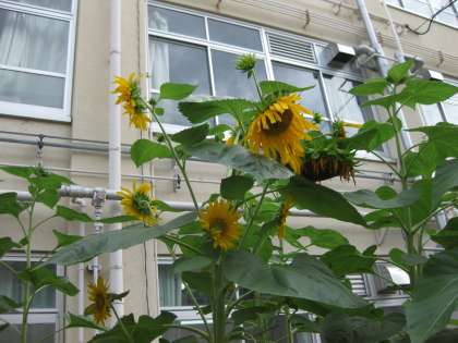 中庭に咲くヒマワリですが,なんと背が高い花は,4mぐらいありそうです。その中で,ちょっと変わったヒマワリが咲いています。なんと,1本の茎から花がつぼみも含めて20個近くもあります。このヒマワリが,今後どのように成長するのか楽しみです。