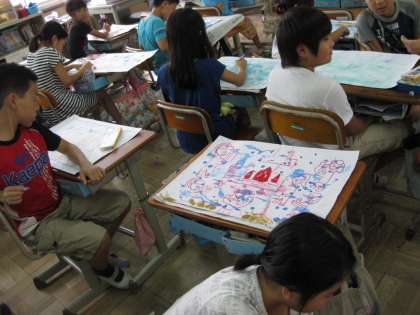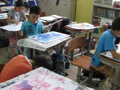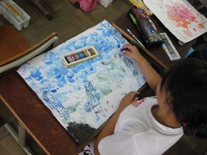 みさきの家の思い出を,新聞にした4年生ですが,今度は絵に表現しています。下塗りを工夫して取り組んでいました。写真とは違う思い出が,絵の中にいっぱいつまっています。絵の中から,笑い声や歌い声が聞こえてきそうでした。