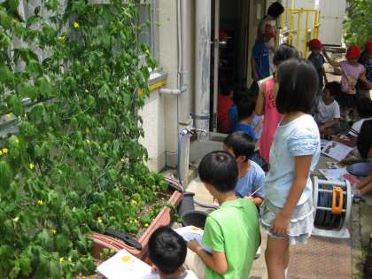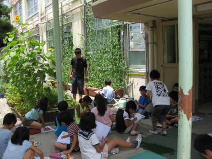 こちらの4年生は,ツルレイシの観察中でした。1週間ほど前は,1mぐらいの背の高さだったのに,今日観察してみると3mに近づいています。また,花もいっぱい咲いています。ども植物もこの時期はすごく成長しますね。