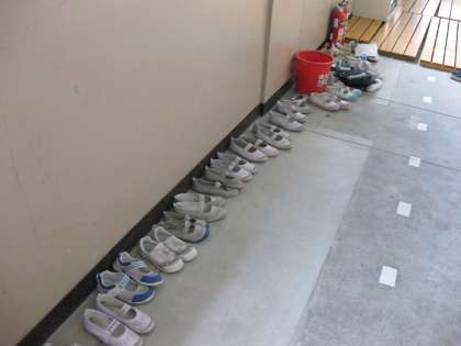 家庭科室で,賀茂ナスを調理している5年生の上靴です。これも綺麗にそろっています。気持ちをそろえて調理実習をすれば,美味しい料理ができるし,包丁で手を切ることもないと思いますよ。