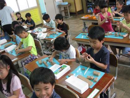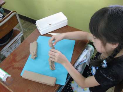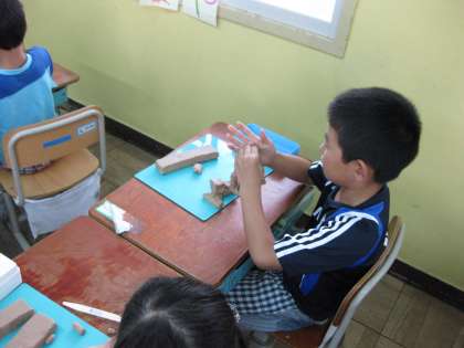 1年生が集中して粘土でなにやら作っています。粘土で積み木を作るそうですが・・・・