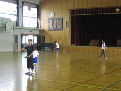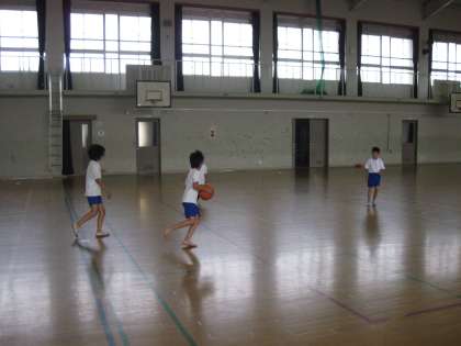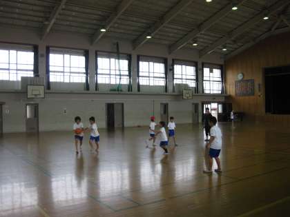 1組では,夏休み中にお誕生日を迎えるお友達のために,体育館でお誕生日会をしていました。お誕生日会の一つのプログラムでしょう,みんなニコニコと楽しそうにバスケットボールをしていました。