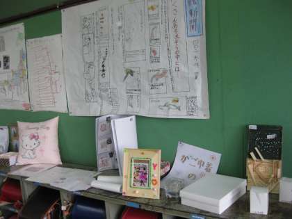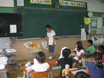 4年生のクラスをのぞいてみると,夏休みに制作した作品や研究した成果が書かれた掲示物が綺麗に並べられていました。どの作品も力作です。4年4組では,ちょうど作品の紹介をみんなの前でしているところでした。上手に作れたね。