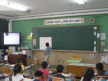 夏休みあけの2日目ですが,どの学年もしっかりと学習が始まっています。「夏休みぼけ・・・・」なんていってられないですね。みんな生活習慣は戻っていますでしょうか。ちょっと,授業中に姿勢が乱れるのが早い子も見かけます。しかし,1年生は算数の授業をはりきって受けていました。