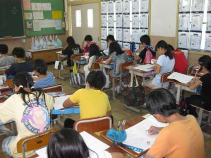 6年生の教室からは,全く話し声がしません。どうしたのかなと思って,そっと教室に入ってみるとテストをしていました。今頃テスト・・・?とよく見たらジョイントプログラムを実施中でした。夏休みにしっかりと学習した成果を発揮してくださいね。