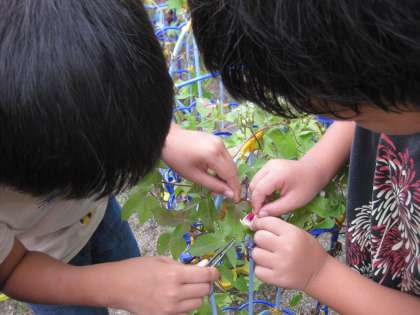 1年生がアサガオを観察しているところに,5年生が理科の実験をしに来ました。先日アサガオのおしべとめしべの秘密を探る続きです。