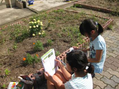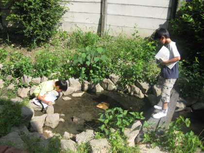 4年生の子ども達が「季節と生き物」学習をするために中庭や運動場,そしてビオトープで観察していました。今の時期は,とっても微妙な時期です。真夏でもないし,秋でもないし・・・。こんな時の生き物は,どんな特徴があってどんな生き方をしているのでしょうね。