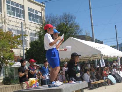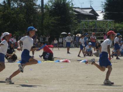 児童会主催のエントリー種目「リレーA」です。児童会の代表が集合をかけて指示をしていました。この他に「リレーB」「玉入れ」「綱引き」も児童会主催のエントリー種目です。それぞれの担当者がしっかりと司会・進行をやり遂げることができました。ご苦労様でした。