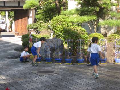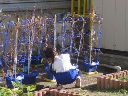 1年生はアサガオに,今でも熱心に水やりをしている子もいます。また,こぼれ種を見つけてひろう子もいます。