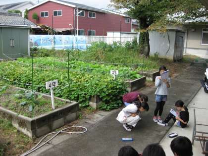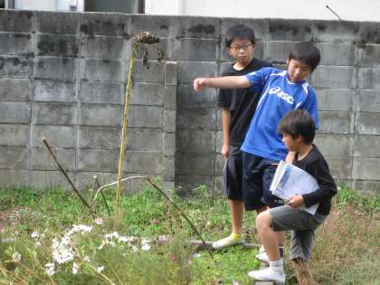 中庭や畑で4年生が,秋の生き物調べをしていました。「幼虫も何にもいないなぁ」とつぶやきながら目をこらす子もいます。最近,朝晩冷え込むことが多くなったので生き物も少なくなりました。