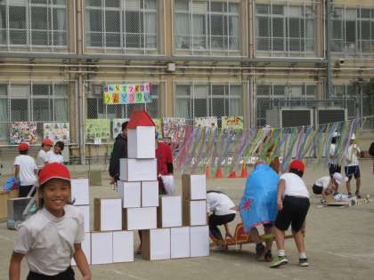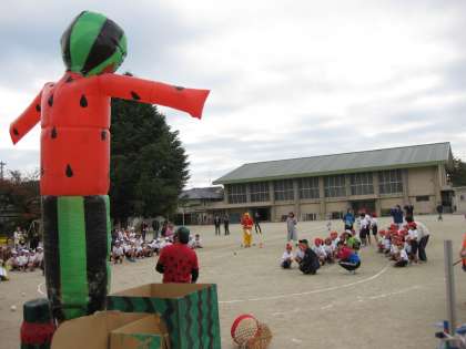 そりをかついで,途中で段ボール箱を運んでいくと,氷の城ができたり,大きなスイカマンとイチゴままが出てきたり驚きの連続でした。