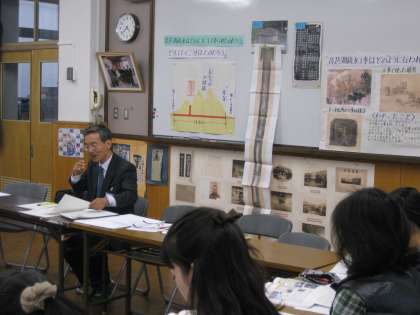 授業が終わって、いつものように事後の研究会がもたれました。今回も、指導助言をいただくのは京都市教育委員会の特別訪問指導員の吉見先生です。吉見先生には、これで4回目のご指導をいただきました。