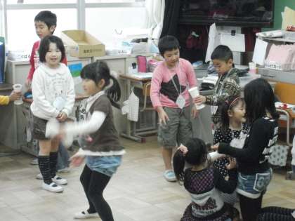 その後 教室内で 手づくりのけん玉で一緒に遊びました。2年生は,上手に遊び方を教えてあげていました。