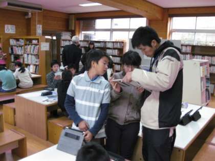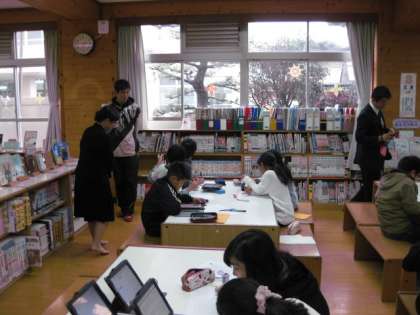 タブレットPCと図書をうまく使っている子ども達をみられて感心しておられました。担任の先生とも話を交流されて、本校にとっても意義のある訪問でした。