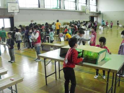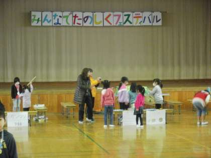 今日 1時間目から5時間目まで 体育館で2年生の「みんなでたのしくフェスティバル」がありました。1年生,上賀茂幼稚園,上賀茂保育園,1組の園児・児童を招待しました。2年生が考えたゲーム等の遊び。とても工夫されていて,とても楽しい物ばかりでした。