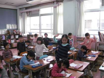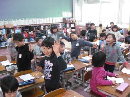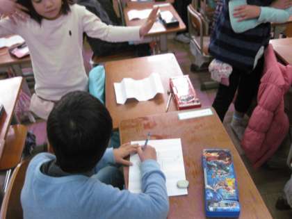 1年生が,おかしな格好でじっとしています。絵を描くためのモデルだそうです。「のってみたいな」という題材だそうですが,はじめは,ほとんどの子が「バンザーイ」のポーズばかりだったようです。それで,動きのあるポーズを描くために,お隣の子がモデルになったそうです。