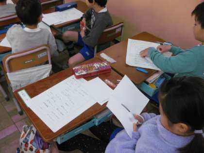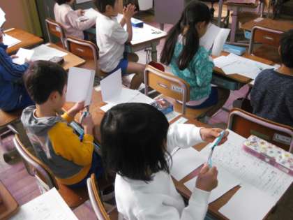 1年生が国語の時間に画用紙を切っていました。国語の時間なのに・・・図工?・・・