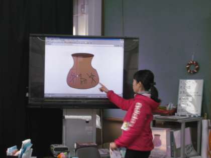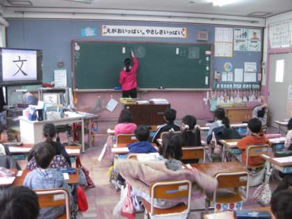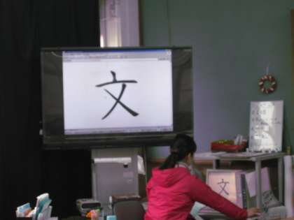 1年生も,この時期はどんどんと漢字を練習して覚えていきます。今日は,「文」という漢字を習いました。コンピュータと電子テレビをつないであるので,漢字の成り立ちソフトを使って,「文」という漢字も成り立ちを教えてもらいました。どうやら,壺の模様の一部からできあがったようです。