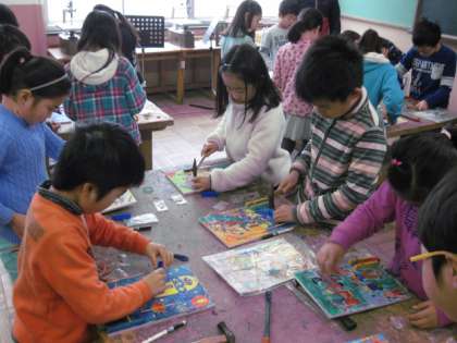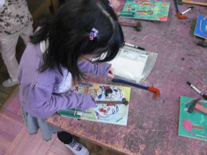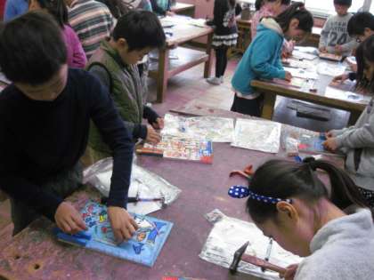 3年生がカナヅチを使って上手に釘を打っています。手作りのボードゲームを作っていました。早く完成させて遊びたいですね。