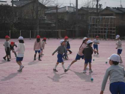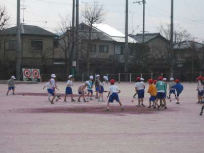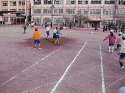 ボールけり遊びを1年生が楽しそうにしていました。ボールをける線と中央線があって,中央線より向こう側に,玉入れの玉がたくっさん入っていれば勝ちです。制限時間を気にしながら,必死になって相手陣地に玉を蹴り入れていました。