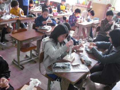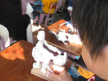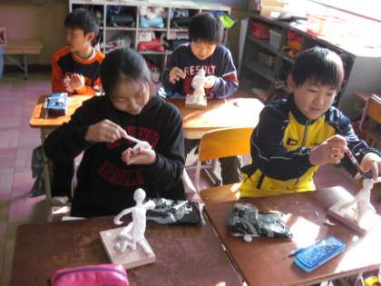 針金を使った骨格で動きのある様子をあらわし,紙粘土で肉付けをしていきます。スポーツをしている場面を作っている子が多い中,「パソコンをしている人」を作っている子がいました。これもなかなか味わいがあっていいですね。