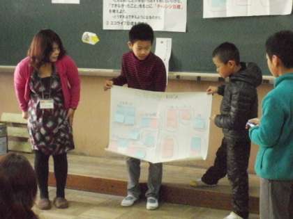 自分の活動をグループ内で交流した後,みんなにおすすめの取組やチャレンジしたい取組などを グループで考え 学級のみんなに発表しました。「エコバックを使う」「水を出しっぱなしにしない」など たくさんの考えが出ました。