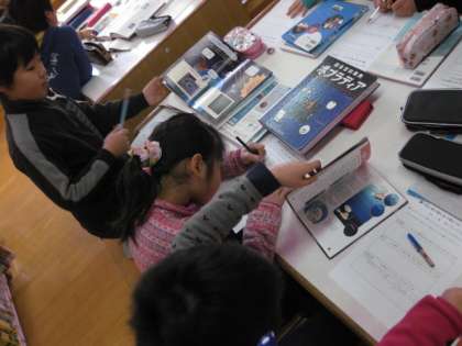 図書館で3年生が,自分の調べたいものを図鑑などを使って調べていました。理科の学習ではなく,社会の学習でもありません。国語の学習です。この単元では,調べたことをどのようにすれば分かりやすく,みんなに伝えることができるのだろうかという学習のようです。しっかりと調べて,上手にみんなに伝えてくださいね。
