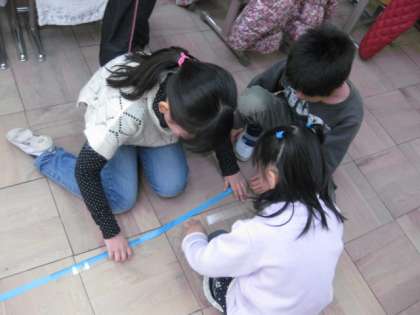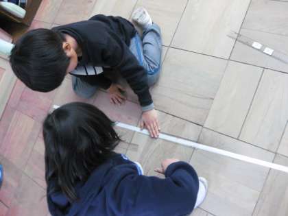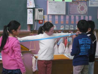 2年生の子ども達が,ながーーーいテープを苦労して計っています。うまく計れたかな?