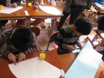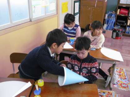 1年生も工作の時間です。大きな帽子を作っている最中でした。このクラスは,ちょうど組み立てる段階でした。まるくした厚紙をのりでとめるのに一苦労です。自然とお隣同士が手を貸し合っていました。