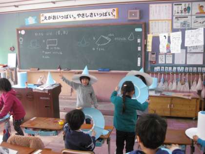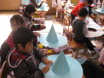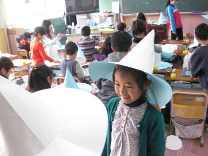 お隣のクラスでは,もう貼り付けが終わって,実際にかぶっている子もいました。これから,楽しい飾り付けになるのでしょう。一つ一つ個性のあるすてきな帽子のできあがりが楽しみです。