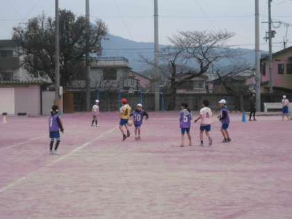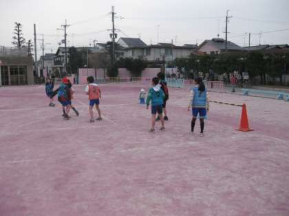 4年生が,運動場でサッカーをしています。もうこの単元も終わりに近くなったのでしょう。みんな,かなり動き方が分かってきたようです。