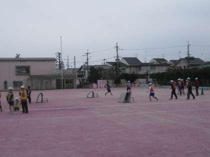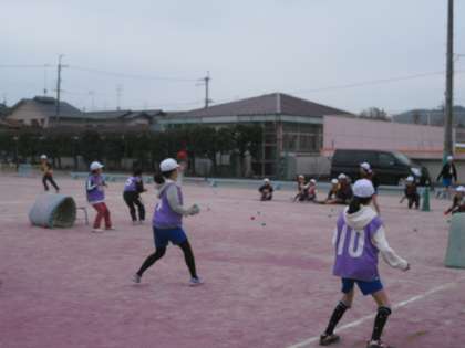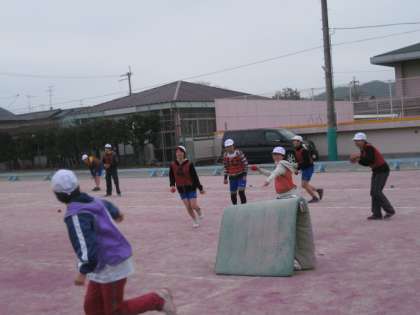 6年生が,赤白玉を投げ合っています。フィールドの所々にたまよけもあります。雪の多い地方でしている雪合戦です。相手の陣地のカラーコーンを奪い取ったら勝ちのようです。笑顔一杯で楽しんでいました。