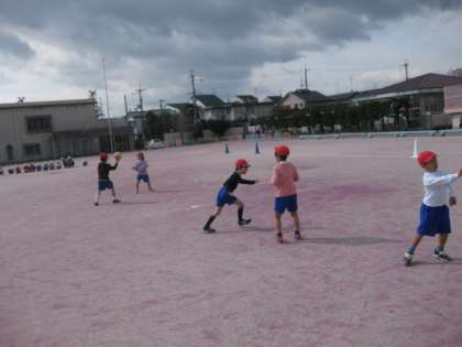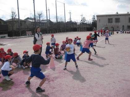 1年生が,2人組になってリレーをしています。ただのリレーではありません。ボールをふたりでパスをしながらカラーコーンを回ってきます。ボールを受けるのに集中してると前には進みません。1年生にとっては,なかなか難しいですね。でも,これが高学年のバスケットボールにつながります。