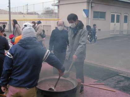 つきたてのお餅は,おぜんざいに入れていただきます。大きな釜でぜんざい作りです。