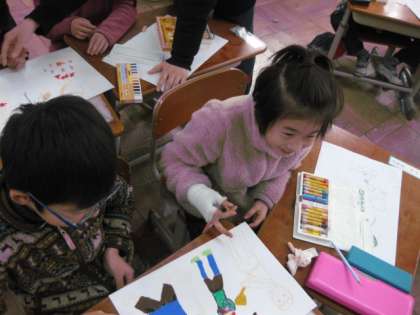 体育館で卒業式の練習かと思えば,1年生の教室では,この4月に入学してくる1年生のために,教室の後ろに貼る掲示物を作成中です。