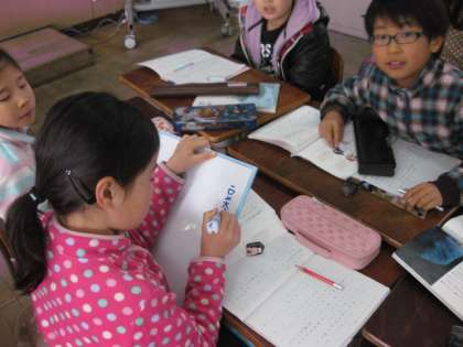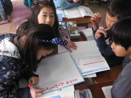 3年生では,国語で「モチモチの木」を学習しています。今日は,その物語に出てくる豆太がどんな人物かを話し合っていました。話し合いのポイントなる言葉をホワイトボードに書いています。簡単に消すとことできて,また次のおもいをすぐに書くこともできるので便利ですね。