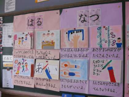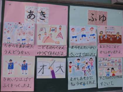 新1年生のために,四季の行事を描いていた1年生ですが,やっと完成をしました。今の1年生の気持ちが絵にこもっていて,温かい気持ちになります。