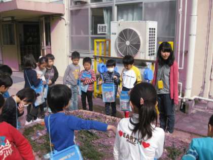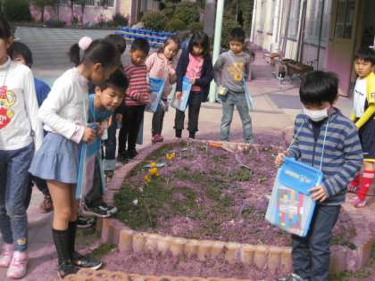 1年生が,先日花壇に植えた花を観察しにきました。昨日も今日も,春本番を思わせるような陽気になりました。植えた花も,葉を一杯に伸ばして,気持ちよく背伸びをしているようですね。
