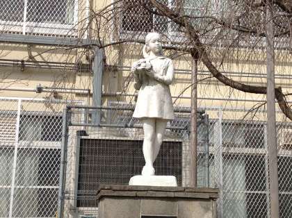 次に,みのりのぞうのことをしょうかいします。みのりのぞうは,運動場にあります。やえざくらの下にあります。女の子で,フルーツのかごをもっています。コンクリートでできています。みんな遊びの待ち合わせの場所に,よくつかわれます。