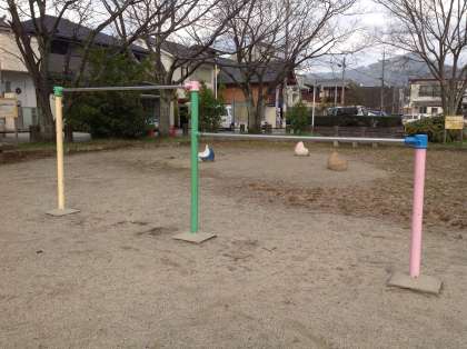 遊具は、すべり台、ブランコ、鉄ぼうの3つです。あと、鉄棒のおくに、うさぎとペンギンと、オットセイの、小さい子でも遊べる遊具もあります。そこでは、小さい子だけではなく、小学生が、バランスゲームをしたりすることもあります。すべり台では、ありじこくをする人が、多いです。他には、休むところがあり、つくえが2つとベンチが5つぐらいあります。