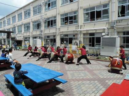 中間休みに中庭で太鼓クラブの皆さんによるパフォーマンスが披露されました。その迫力ある演奏に,どんどんギャラリーも増え,各教室の窓からも,たくさんの人が演奏に聞き入っていました。ステキな演奏をありがとうございました!