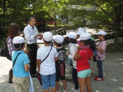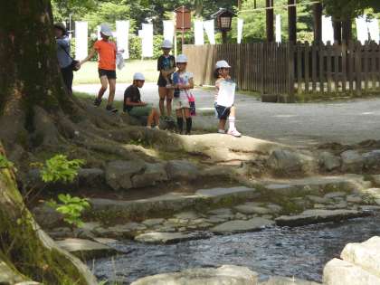 上賀茂神社の中を流れる川です。昔,小川のそばに「ならの木」がたくさん植えてあり,その葉を使ってお皿を作り,そのお皿に神様へのお供え物をのせてお供えしていたので,「ならの小川」と言うようになったそうです。
