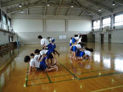 6年生の1クラスが、ねっこタイムの時間を利用して、組体操の特訓中です。