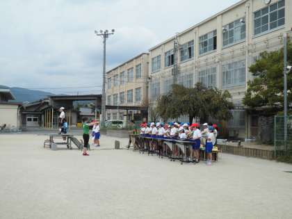 器楽係の演奏に合わせて、開会式が始まりました。プラカード係を先頭に全校児童が入場します。