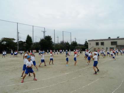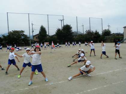 みんなの踊りの中心に、クラスの旗がなびいています。