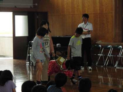 体育館で視覚に障害のある方からお話を聞きました。盲導犬にも接しました。