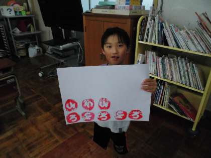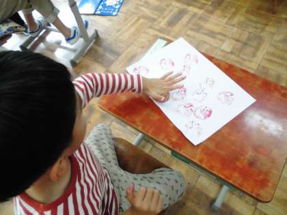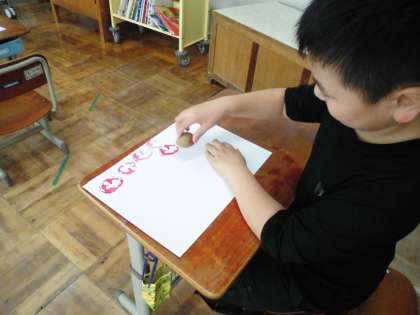 今日の5時間目は、赤い絵の具をつけて、スタンピングの真っ最中。とっても嬉しそうでした。