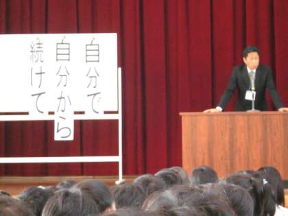 次に、校長先生のお話です。「ノーベル賞」のお話の後、「自分で」「自分から」そして「続けて」思考・探究・行動することの大切さについてのお話がありました。