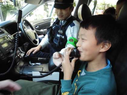 パトカーにも乗せていただき、マイクを使って話もしていました。
